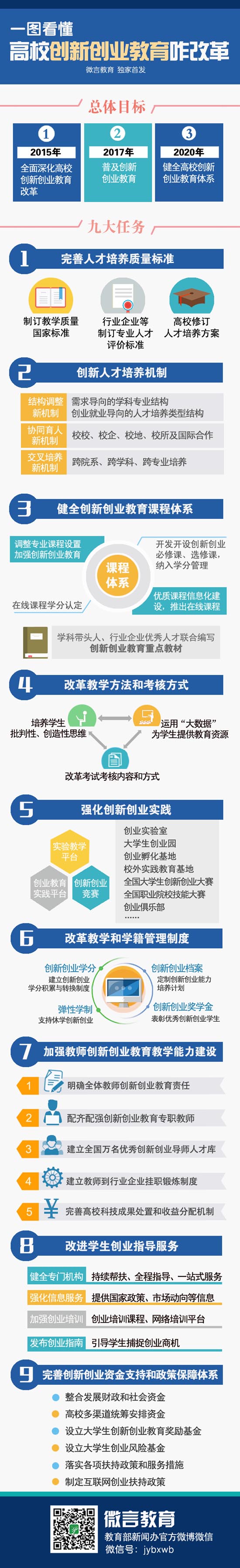 如何使创新创业成为管理者办学、教师教学、学生求学的理性认知与行动自觉?记者今天从教育部获悉,2015年起将全面深化高校创新创业教育改革,瞄准9项改革任务,推出30余条具体举措,力争2017年取得重要进展,形成一批可复制可推广的制度成果,普及创新创业教育,到2020年建立健全课堂教学、自主学习、结合实践、指导帮扶、文化引领融为一体的高校创新创业教育体系。