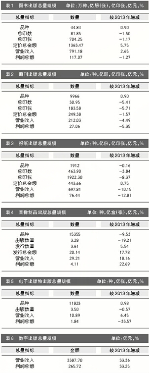 全国共出版期刊9966种,较2013年增长0.9%;总印数31.0亿册,降低5.4%;总印张183.6亿印张,降低5.7%;定价总金额249.4亿元,降低1.6%。期刊出版实现营业收入212.0亿元,降低4.5%;利润总额27.1亿元,降低5.4%。平均期印数超过100万册的期刊减少1种。表明传统报刊出版面临挑战。