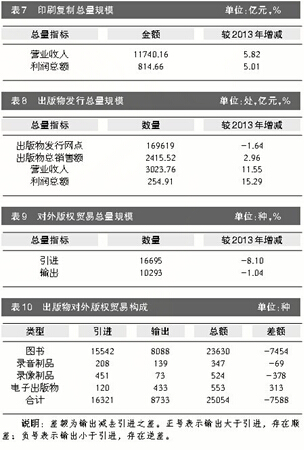 2014年,全国出版、印刷和发行服务实现营业收入19967.1亿元,较2013年增长9.4%;利润总额1563.7亿元,增长8.6%;不包括数字出版的资产总额为18726.7亿元,增长8.8%;所有者权益(净资产)为9543.6亿元,增长5.8%。