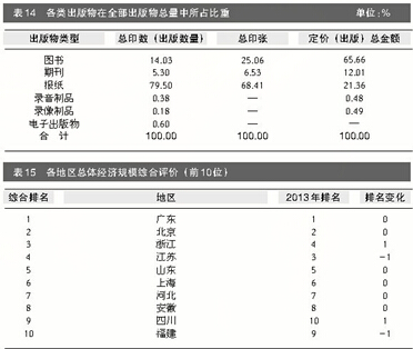 编者按 7月15日,国家新闻出版广电总局发布《2014年新闻出版产业分析报告》。《报告》显示,新闻出版产业在国民经济“新常态”背景下仍继续保持了较好的可持续发展能力。《报告》包括产业总体情况、结构分析、出版传媒集团经济规模与效益评价、出版发行和印刷上市公司规模与效益分析、图书出版单位经济规模综合评价、产业基地(园区)情况分析等方面。本版特摘取其中重要部分刊登,供读者参考。