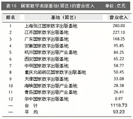 在12家国家数字出版基地(园区)中,营业收入降序依次为上海张江国家数字出版基地、江苏国家数字出版基地、广东国家数字出版基地、安徽国家数字出版基地、杭州国家数字出版产业基地、西安国家数字出版基地、中南国家数字出版基地、重庆北部新区国家数字出版基地、天津国家数字出版基地、海峡国家数字出版产业基地、青岛国家数字出版产业基地和华中国家数字出版基地。其中营业收入超过200亿元的有2家,降序依次为上海张江国家数字出版基地和江苏国家数字出版产业基地;在100亿元~200亿元之间的有1家,即广东国家数字出版基地;在50亿元~100亿元之间的有5家。