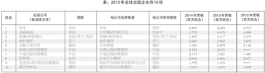 (译自威琛巴特贸易内容咨询公司网站发布的2015年《全球出版企业排名报告》及美国《出版商周刊》)