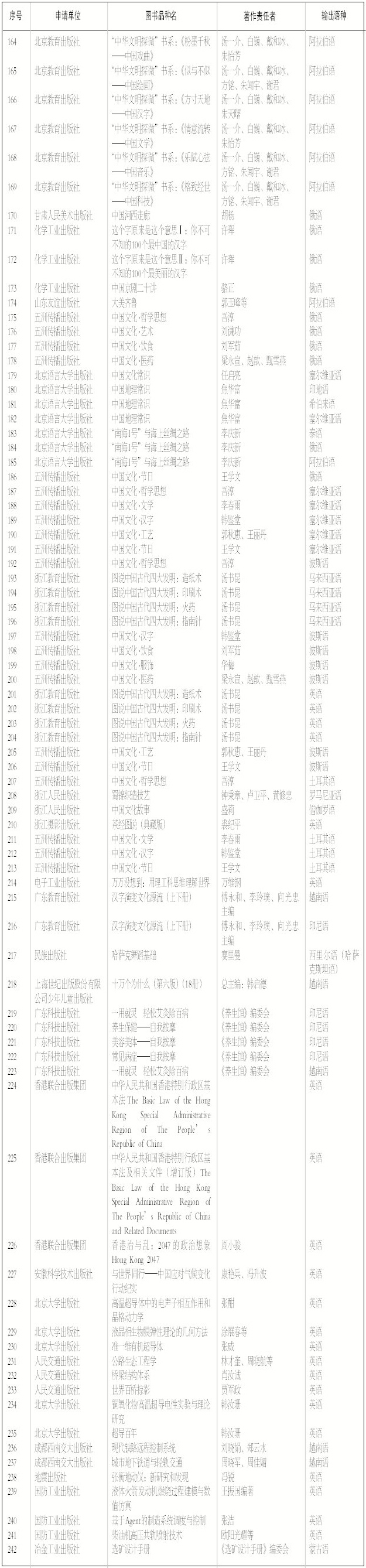 根据《关于申报2015年度“丝路书香工程”重点翻译资助项目的通知》,国家新闻出版广电总局“丝路书香工程”重点翻译资助项目办公室自2015年4月正式启动2015年项目申报和评审工作。经过前期审核、评审委员会增补评审,确定了50家申报单位的242个品种拟予资助。现将名单予以公示。