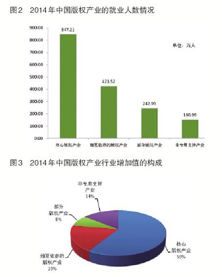 2014年,中国核心版权产业的城镇单位就业人数为847.21万人,占全国城镇单位就业总人数的4.64%,占全部版权产业的51%。在核心版权产业中,软件和数据库、新闻出版、设计、广告等行业保持了较快增长态势,对版权产业就业人数的贡献较高,占到了核心版权产业的90%。