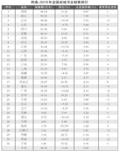 2015年,全国省域书业销售735.57亿元,同比增长0.31%,占全国书业的比重为94.32%,比上年提高0.07个百分点。至当年末即“十二五”“十三五”之交,全国省域书业的一个最大变化即:自本世纪初以来,持续雄踞全国省域书业销售“龙头”13年的“霸主”——江苏易位,湖南取代江苏成为新的省域销售“龙头”。(见附表)这对中国书业来说无异于一“爆炸性新闻”。自2002年江苏从广东手中夺得省域销售“龙头”桂冠后,13年间一直称雄省域书业“霸主”地位。其间虽居第二位者多有变化,但江苏的省域书业第一把交椅地位始终无可撼动,而且江苏的销售曾几年与第二位者的差距达10亿元之巨。自2012年湖南跻身省域销售第二把交椅后,其与江苏的角力持续了4年。蓄势良久的湖南一上场就咄咄逼人,2013年其与江苏的差距仅为1.55亿元;次年其进一步把差距缩小至0.23亿元;2014年其与江苏共同晋阶年销售60亿元级阶,成为这一销售档级仅有的一对伙伴;2015年,其反超江苏摘得省域销售桂冠,成为站在“十三五”起跑线前新的中国书业销售“龙头”。湖南三年坐二望一,四年反超,验证了一个浅显的道理:不进则退——湖南与江苏抗衡4年,4年间湖南销售年年递增,而江苏却有两年销售下降,特别是2015年湖南销售同比增长10.20%,而江苏销售却同比下降10.91%,这一增幅和降幅几近相等的反差,酿成了14年间全国书业销售“龙头”的首次易主。江苏书业的销售下滑还导致全国省域书业销售居60亿级阶的,从上年的2省减为1省。
