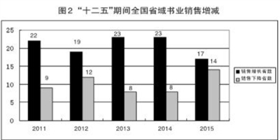 书业销售下降的省(区、市),从前两年的8省(区、市)骤扩至14省(区、市),增幅达75%,不可谓不大。这种变化,反映了中国书业面临态势的严峻,这种状况在“十三五”期间或继续加剧,或得以缓解,只能拭目以待。业界对此一应正视,二应重视,各省书业特别是“十二五”“十三五”之交销售下降的省应施以新的切实可行的举措,首先要止住下滑,继而扭降为升。传统出版、纸质阅读将与数字出版、屏读及移动阅读长期共存,已为全民共识。基于这一共识,中国书业在与数字出版、新媒的融合中发展自己不仅可能,而且正被愈来愈多的实践所验证。