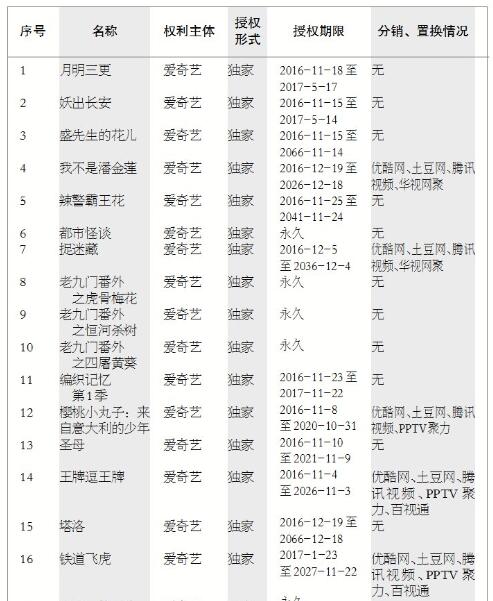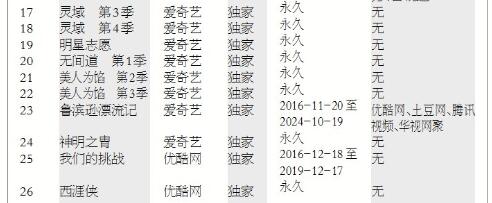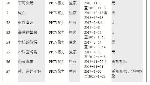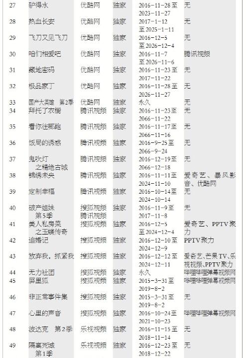1月20日,国家版权局公布2017年度第一批重点作品版权保护预警名单,其中包括《我不是潘金莲》《铁道飞虎》等57个影视作品。预警信息包括作品名称、权利主体、授权形式、授权期限以及分销、置换情况。