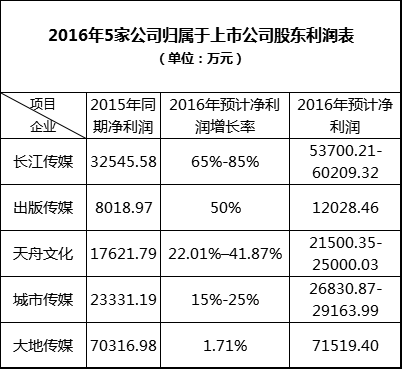 编者按:近日,长江传媒、出版传媒、天舟文化、城市传媒、大地传媒5家出版业上市公司陆续发布2016年业绩快报或预增公告。商务君整理了相关情况,他们究竟发展怎样?我们先睹为快!
