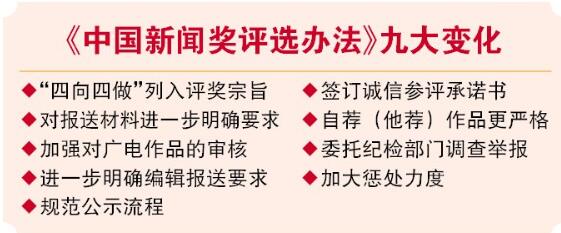 一是将“四向四做”列入评奖宗旨。《评选办法》全面贯彻落实习近平总书记在会见中国记协第九届理事会全体代表和中国新闻奖、长江韬奋奖获奖者代表时发表的重要讲话精神,将总书记勉励新闻工作者的“四向四做”列入中国新闻奖评奖宗旨。二是对报送材料进一步明确要求。中国新闻奖参评作品材料以及作品刊播信息(刊播时间、栏目、版面等)必须与刊播时一致。三是加强对广电作品的审核。要求参评人务必妥善保存广电类参评作品的首发播出栏目原版以及参评作品和所在栏目的内部编辑、制作和播出审批凭据(含数字系统编审痕迹)。四是在《评选办法》中进一步明确对编辑的报送要求,在消息类、新闻摄影项目中,应报1至2名编辑;在广播、电视作品等项目中,强调主创人员应包括编辑。五是规范公示流程。要求各单位完整公示拟参评作品的全部申报材料,并在申报时提供每件作品公示网页地址备查。六是签订诚信参评承诺书。每个报送单位、每个参评人必须签订诚信参评承诺书。七是要求自荐(他荐)作品须获得省部级以上或中央新闻单位社(台)级新闻奖,且须有2名新闻专业副高及以上职称的人士实名推荐。八是中国记协评奖办公室负责受理公示期间有关举报,按照本办法规定对举报事实进行认真核查,并委托相关地方主管单位纪检部门介入调查,提出处理意见报评委会主任会决定。九是加大惩处力度。对违规参评作品一经查实,即撤销该作品参评或获奖资格;对推荐单位和报送单位予以通报批评,被通报的推荐单位、报送单位不得参加下一届该项目评选。