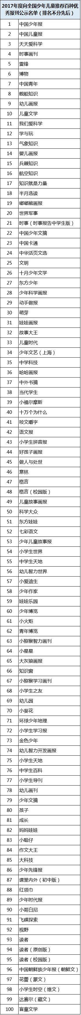 5月22日,国家新闻出版广电总局(简称“总局”)下发《2017年度向全国少年儿童推荐百种优秀报刊名单公示》。通知表示,为深入贯彻落实全民阅读工作部署要求,推动青少年阅读更多精品报刊,国家新闻出版广电总局于今年4月印发通知,向全国少年儿童推荐百种优秀报刊。各地区各部门共报送推荐245种报刊,总局在对报送报刊进行资格审查和编校质量检查后,组织专家评审,确定了《中国少年报》等100种报刊入围推荐名单,名单如下(排名不分先后):