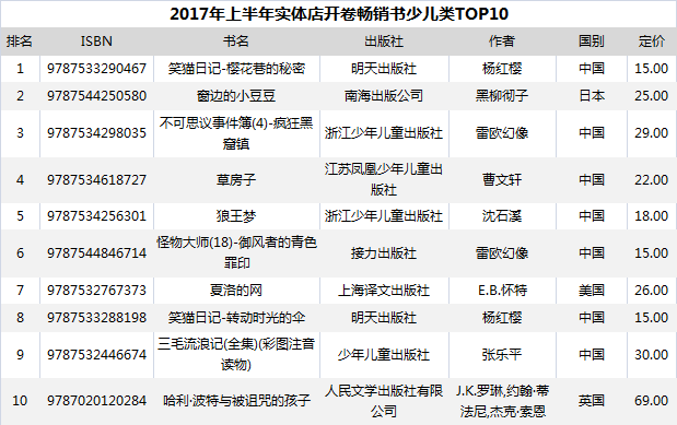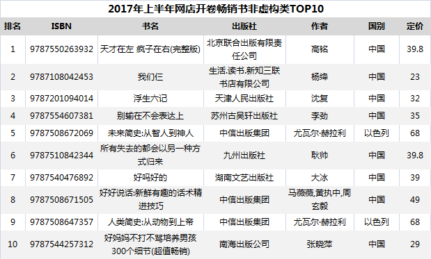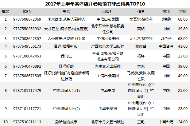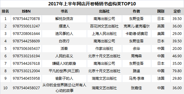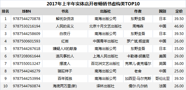 2017年上半年虚构类、非虚构类、少儿类的榜首书分别是东野圭吾《解忧杂货店》、尤瓦尔·赫拉利的《未来简史:从智人到神人》和杨红樱的《笑猫日记-樱花巷的秘密》。