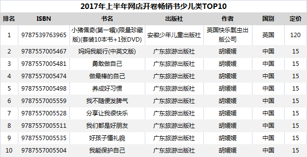 此外,引进版图书在国内市场表现非常突出,近几年,海外作者图书市场规模持续走高,单品收益能力也不断上升。2017年上半年实体店虚构类前100名中的境外作者作品有38种,《解忧杂货店》《白夜行》《嫌疑人X的献身》《追风筝的人》等作品都名列榜单前列;2017年上半年实体店非虚构类前100名的境外作者作品有24种,《未来简史:从智人到神人》《人类简史:从动物到上帝》《名人传》等引进版图书进入了榜单前20名;2017年上半年实体店少儿类榜单前100名中的境外作者作品有24种,《窗边的小豆豆》《夏洛的网》《哈利·波特》进入了榜单前10名。