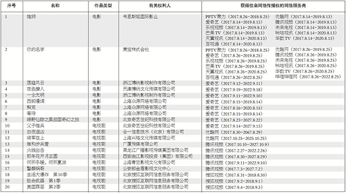 按照《国家版权局办公厅关于进一步加强互联网传播作品版权监管工作的意见》及国家版权局版权重点监管工作计划,根据相关网络服务商上报的获得作品授权的情况,现公布2017年度第十批重点作品版权保护预警名单。