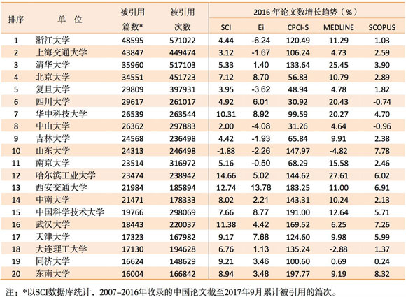 从统计结果来看,2016年我国发表SCI论文引用篇数和次数较多的高校是浙江大学、上海交通大学、清华大学、北京大学、复旦大学、四川大学、华中科技大学、中山大学、吉林大学、山东大学等。