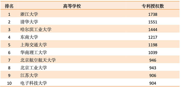 授权专利是衡量一所高校创新能力的重要指标。从统计结果来看,2016年我国高校中获得专利授权数较多的高等学校分别是浙江大学、清华大学、哈尔滨工业大学、东南大学、上海交通大学、华南理工大学、北京航空航天大学、北京工业大学、江苏大学和电子科技大学。