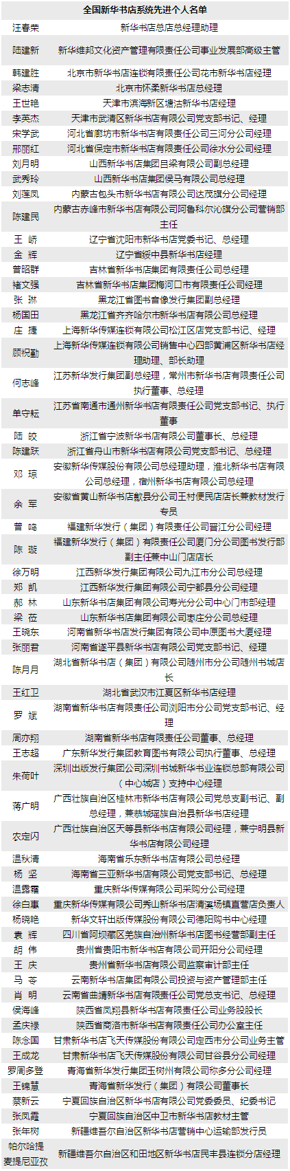 日前,国家新闻出版广电总局公示了“全国新华书店系统先进集体和先进个人拟表彰名单”,根据国家新闻出版广电总局《关于开展2017年全国新华书店系统先进集体和先进个人评选表彰活动的通知》(新广出发〔2017〕49号),各地新华书店和各级新闻出版广电行政部门按照评比条件,自下而上层层推荐;总局坚持好中选优、从严把关,组织专家评审,研究确定了拟表彰的全国新华书店系统先进集体和先进个人名单。