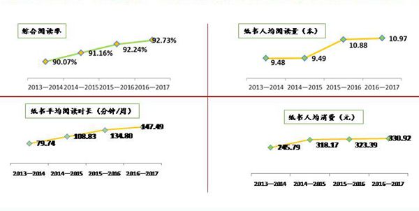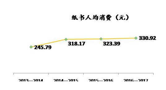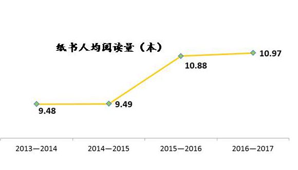 北京市居民人均纸书阅读量10.97本,高于全国人均纸书加电子书的7.86本,2013年至2017年连续4年间,纸质图书的阅读需求大幅增长,人均纸质图书消费增加85元,达330.92元。