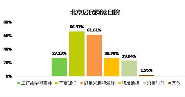 调查结果显示,北京居民在选择读物明确的内容偏好,反映了北京居民日益增长的文化阅读需要,包括借鉴性阅读、欣赏性阅读、实用性阅读、研究性阅读等多样性需求。