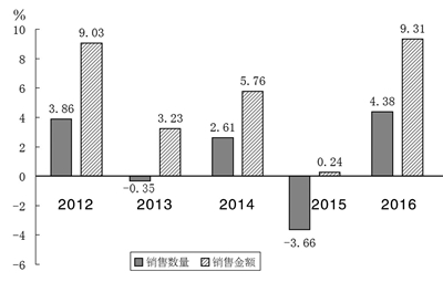 图1 2012~2016年全国书业销售数量、金额同比