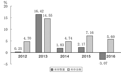 图2 2012~2016年全国书业库存数量、金额同比