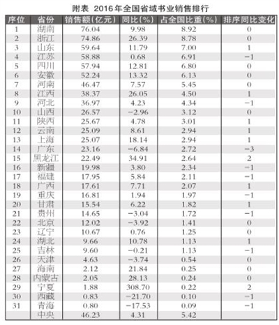 湖南以76.04亿元的销售,再次斩获全国省域书业销售“龙头”位置。湖南自2015年从雄踞全国书业销售“霸主”地位达13年的江苏手中夺得“龙头”桂冠后,业界对其能否保持这一地位或有疑虑,因它毕竟不像老牌“霸主”江苏那样称雄十多年。但湖南以自己近1成的销售增速证明了自己无愧于新“龙头”地位,其不但蝉联全国书业销售第一把交椅,而且把这一位置的级阶从60亿跃升至70亿,创下了全国省域书业销售的一个前所未有的新纪录。当年,湖南不仅再居“霸主”地位,而且还把自己在全国书业的销售比重提升0.05个百分点,从8.87%升至8.92%。2016年湖南书业的销售作为主要为中南出版传媒集团股份有限公司和湖南省新华书店有限责任公司的作为。当年,中南出版传媒集团股份有限公司为我国上市出版传媒公司中资产总额、营业收入和所有者权益均超过百亿元的“三百亿”公司,在出版上市公司总市值排名中位居第1;而湖南省新华书店有限责任公司在全国发行集团总体经济规模排名中位居第3,这两项名列前茅的排位印证了湖南书业的经济实力和销售业绩。特别需要提及的是,湖南书业在国内最大的书业电商——当当的实体店布局中首当其冲:当当梅溪书店登陆长沙,其5000平方米的营业面积,与线上同一折扣的书价,多元文化空间的功能配置,24小时不打烊、体验与实惠兼具的经营模式,无异一条咄咄逼人的“大鳄”浮出水面。湖南书业斩获如此骄人的销售业绩,蕴含了其对当当实体店冲击的成功抵御。