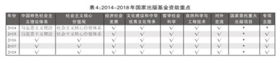 2014~2018年这五年,基金资助的重点是马克思主义理论研究、社会主义核心价值体系研究、经济社会发展建设、中华文化传承、哲学社会科学、自然科学与工程技术、对外文化交流以及专项主题出版八大项。2016年,基金关注重点将马克思主义理论研究细化为中国特色社会主义理论体系,社会主义核心价值体系调整为社会主义核心价值观。(见表4)