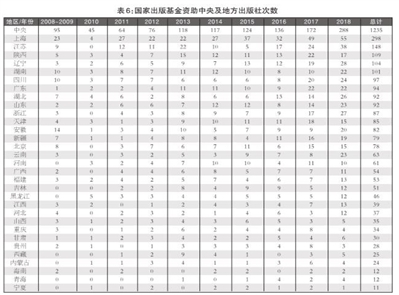 2008~2009年度国家出版基金资助项目为零的地区有7个,此后逐渐减少,并于2015年实现了全国31个省市自治区的全覆盖。但区域分布较为集中,除中央在京出版单位外,上海市的区域优势进一步突出。江苏、陕西、广东、四川、辽宁、天津、浙江、北京、新疆等地区项目数量也都有较大增长。从2018年基金资助来看,中央出版方阵的优势还在继续增强,共入选288个,占35.24%,同比增长4.64%。云南在2018年增长迅速,入选59个项目,同比增长了36个项目。