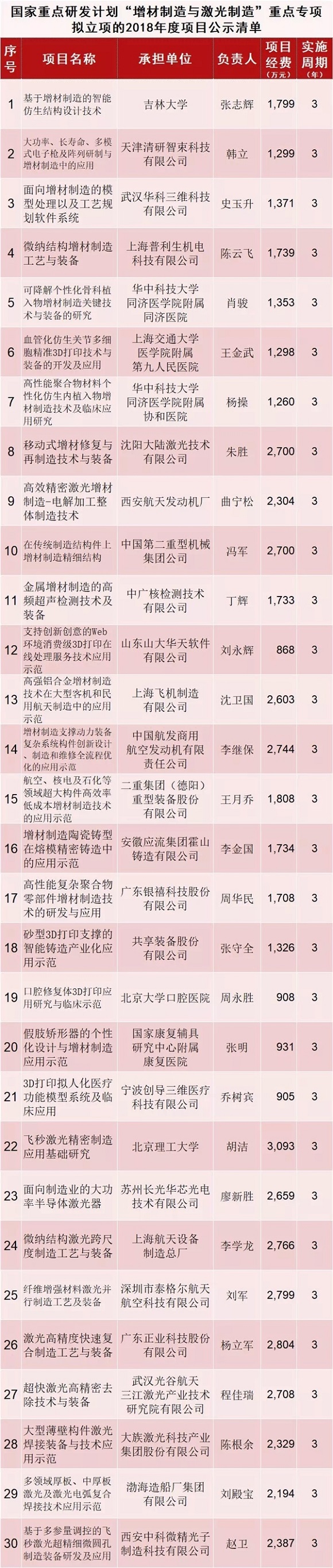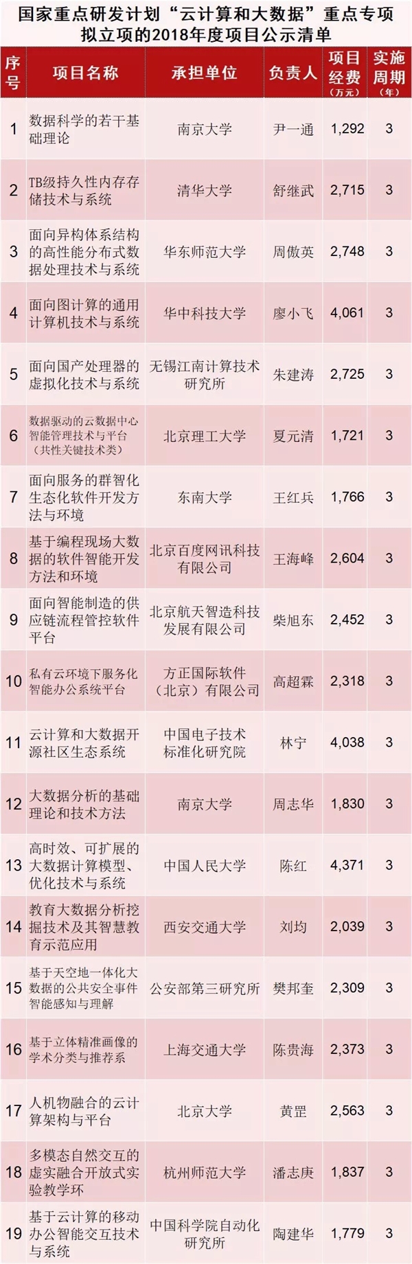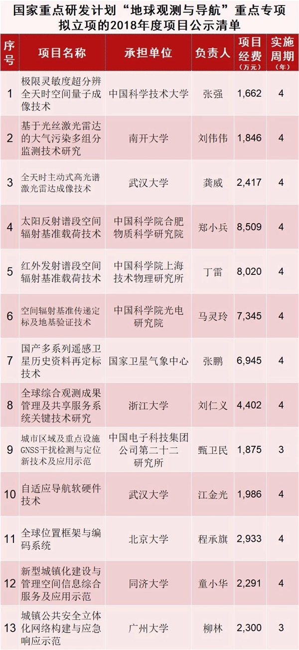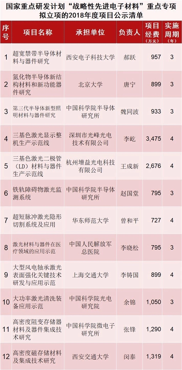 刚刚,科学技术部又公示了8个国家重点研发计划重点专项拟立项的2018年度项目公示清单,分别是“高性能计算”重点专项、“云计算和大数据”重点专项、“地球观测与导航”重点专项、“战略性先进电子材料”重点专项、“增材制造与激光制造”重点专项、“煤炭清洁高效利用和新型节能技术”重点专项、“新能源汽车”重点专项和“先进轨道交通”重点专项。