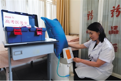 6月4日,北京市二中考点,医务室校医为考生准备了感冒药、葡萄糖、缓解暑热等常用药品。 周良 摄