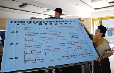 昨日下午,北京市第二中学考点,工作人员开始布置考点示意图,为高考做各项准备。 周良 摄