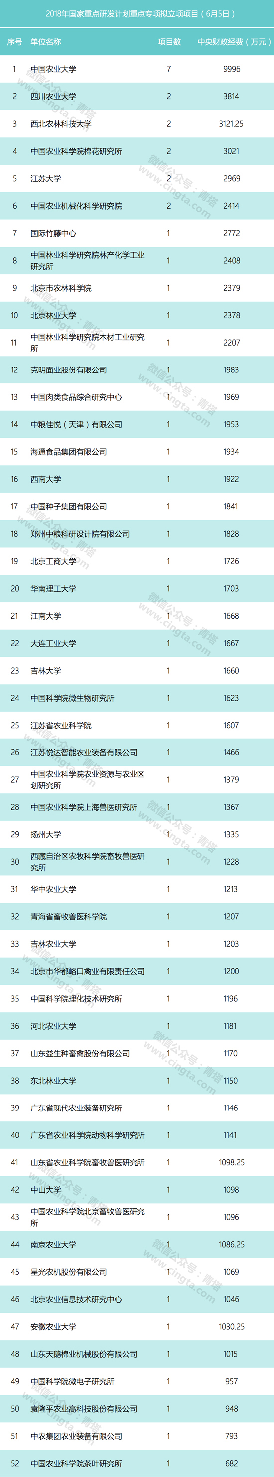6月5日,科技部公示了5个国家重点研发计划重点专项项目公示清单,分别是“七大农作物育种”、“畜禽重大疫病防控与高效安全养殖综合技术研发”、“林业资源培育及高效利用技术创新”、“现代食品加工及粮食收储运技术与装备”和“智能农机装备”,总经费超过9亿元。