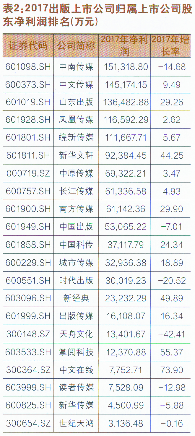 营业收入10亿元以上的出版传媒上市公司还有中国科传、城市传媒、出版传媒、掌阅科技和新华传媒。新经典、天舟文化、读者传媒、中文在线、世纪天鸿的营业收人则在3~10亿元不等。