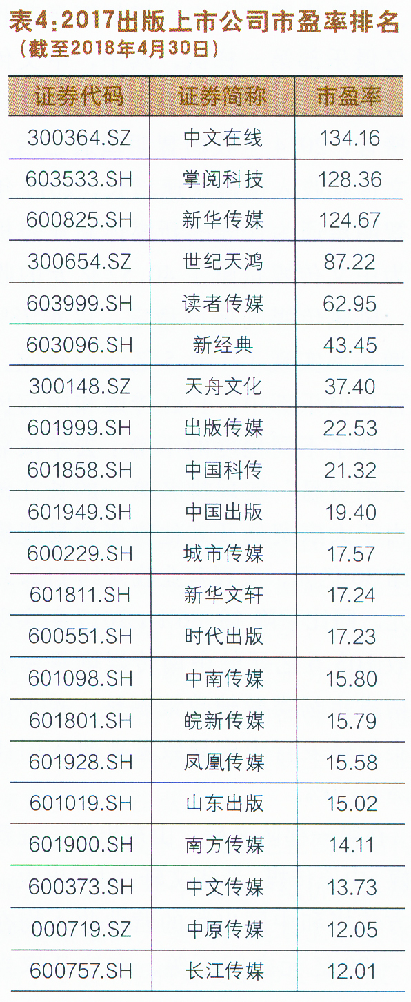 在市盈率方面,出版上市公司的表现则是天差地别。截至2018年4月30日,沪市上市公司平均市盈率为15.64倍,而沪市出版上市公司平均市盈率为37.32倍,创业板上市公司平均市盈率为41.34倍,创业板出版上市公司平均市盈率则为73.96倍,均远高于所在板块平均市盈率,其中中文在线以134.16倍的市盈率高居榜首,掌阅科技、世纪天鸿、新经典等新上市公司的市盈率也表现较好,而国有出版上市公司因为体量较大,市盈率表现不佳,不少上市公司低于所在板块平均市盈率。可以看出,资本市场对于民营资本和出版产业的新业态更为看好。
