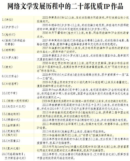 在9月16日下午举行的第二届中国“网络文学+”大会闭幕式上,中国音像与数字出版协会相关负责人揭晓了“中国网络文学二十年系列评审”结果,发布了影响和推动中国网络文学发展历程中的“二十件大事”“二十部优质IP作品”和“二十个关键词”。