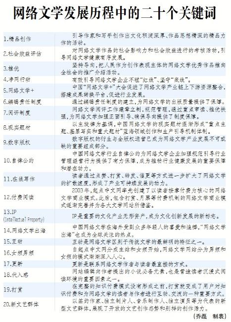 为全面总结和展现中国改革开放40年、中国网络文学20年来取得的辉煌成就,推进和引导网络文学健康有序发展,第二届中国“网络文学+”大会组委会委托中国音像与数字出版协会,对中国网络文学发展历程进行了认真梳理、盘点,广泛征求业内人士及专家意见,遴选出了中国网络文学发展历程中的“二十件大事”“二十部优质IP作品”和“二十个关键词”。通过展现这些标志性事件、代表性作品及关键性词语,与广大从业者一同回望网络文学前行的历程,标注那些探索奋进的坐标,勾勒网络文学一路走来的轨迹,引导广大文艺工作者创作出更多思想性、艺术性、可读性有机统一的健康优质的网络文艺作品,用更多有筋骨、有道德、有温度的作品回馈时代、回馈人民。