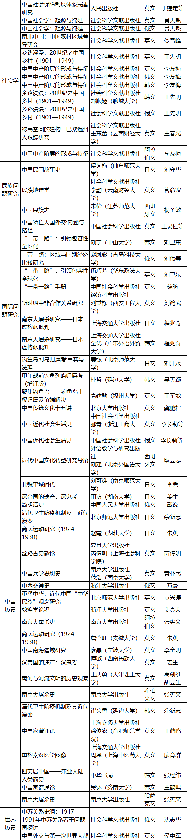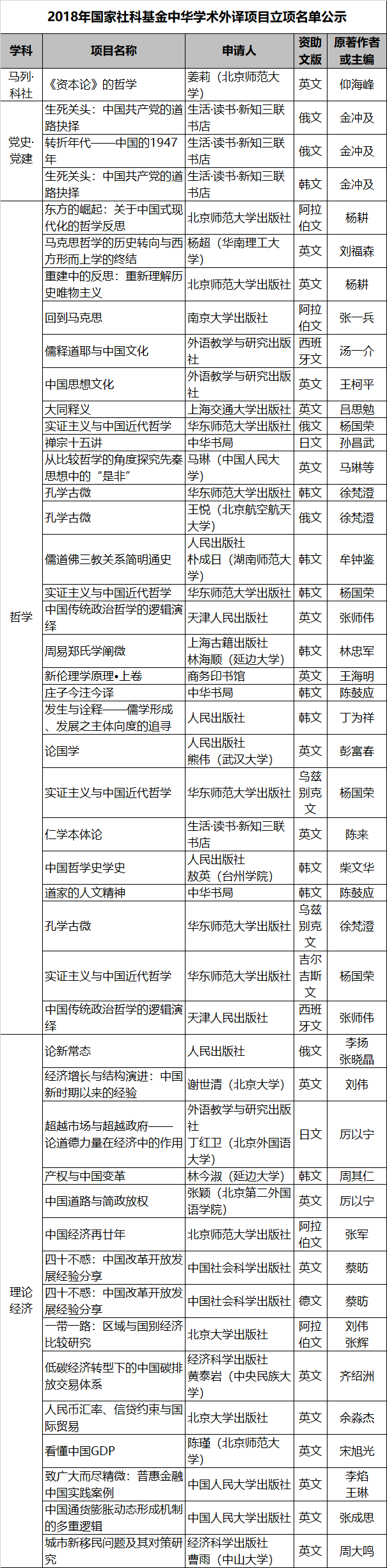 按照《国家社会科学基金管理办法》有关规定,现将2018年国家社科基金中华学术外译项目立项名单予以公示。公示时间为2018年11月22日至28日。公示期内,如有异议,请以书面方式向全国哲学社会科学工作办公室基金处反映,并提供必要的证据材料,以便核实查证。提出异议者须提供本人真实姓名、工作单位、联系电话等有效联系方式(全国哲学社会科学工作办公室将予以严格保密),凡匿名、冒名或超出期限的异议不予受理。