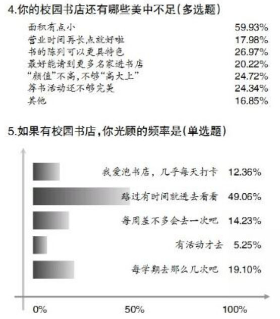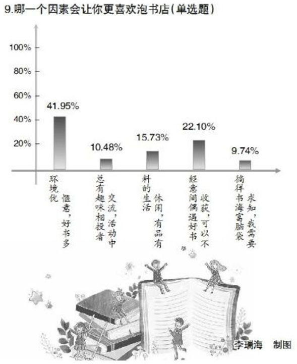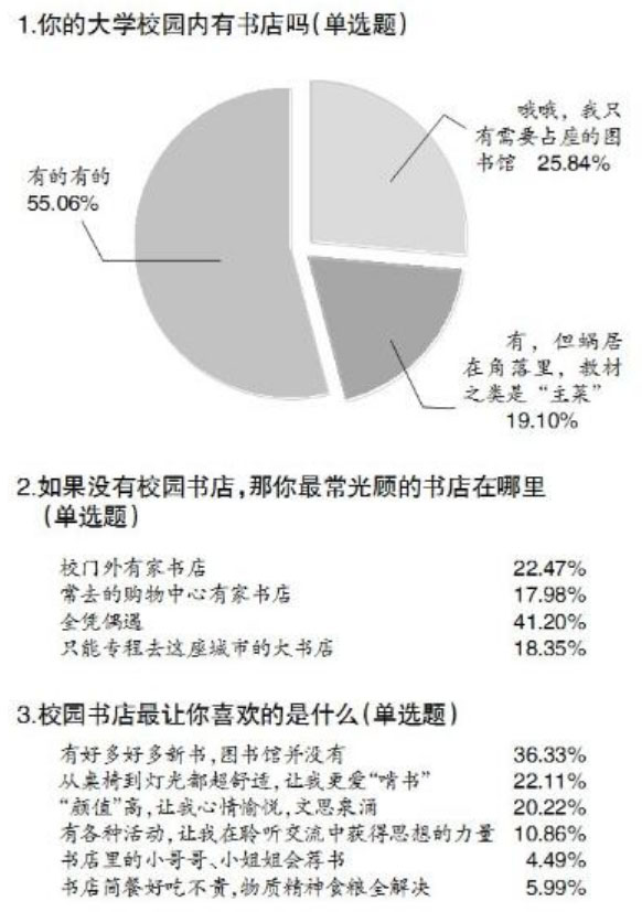 校园最美是书香。对于大学生来说,书店是校园生活一个必不可少的存在。调查显示,47.57%的被调查者认为书店应是校园标配,34.83%的大学生期待一家校园书店。学生们爱上书店的因素有很多,好书位居榜首,比如36.33%的学生说,校园书店有好多好多新书,图书馆并没有。而“哪一个因素会让你更喜欢泡书店”的调查中,41.95%的学生选择好书多、环境优,感觉很惬意,22.10%的大学生被不经意间偶遇的好书打动。