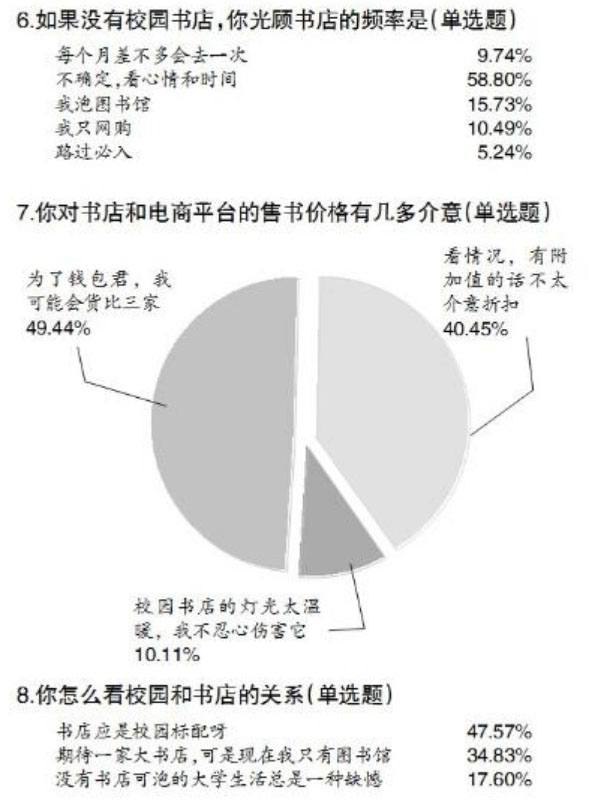 55.06%的被调查者表示自己校内有书店,但这些书店尚有一些美中不足。比如,59.93%的大学生认为,书店面积有点小,26.97%的学生认为书的陈列可以更具特色,24.34%的学生认为荐书活动还不够完美。此外,19.10%的被调查者说,校园书店蜗居在角落里,教材之类是其“主菜”。
