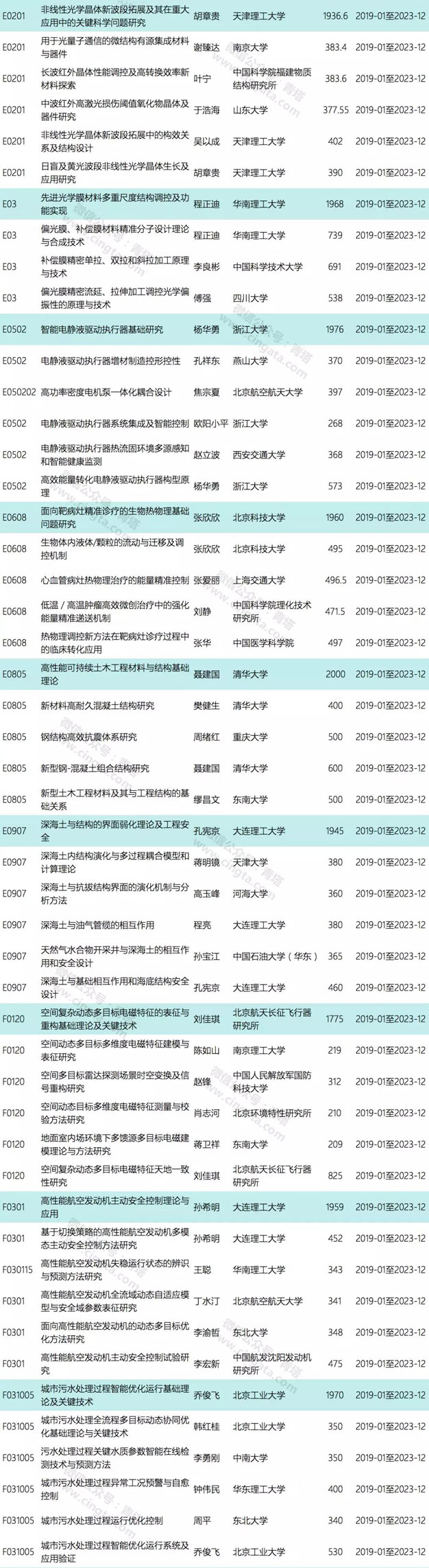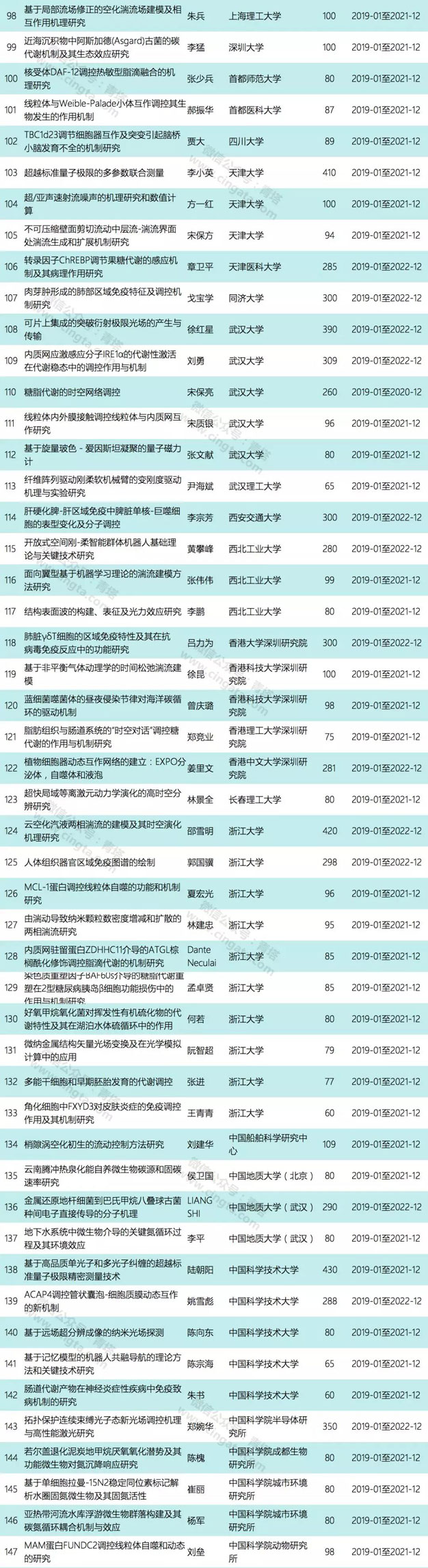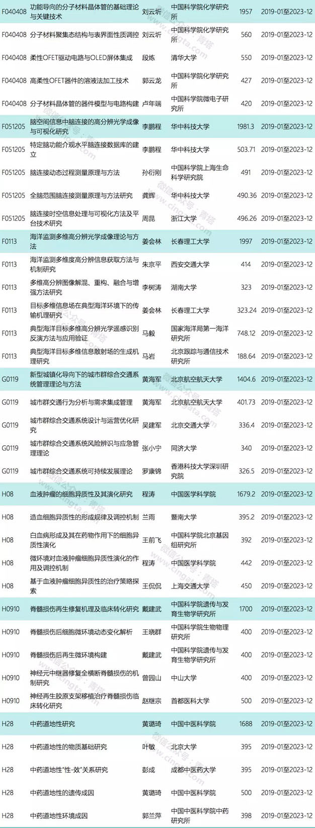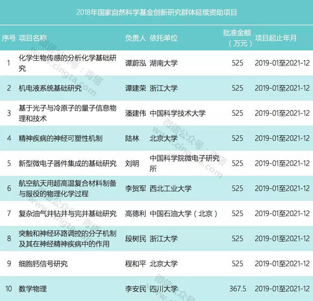 本次公布的项目为创新研究群体延续资助项目,共有10个项目获资助(单个项目的资助强度约为367万或525万)。10个项目来自8家单位,其中北京大学和浙江大学各有2项获资助。