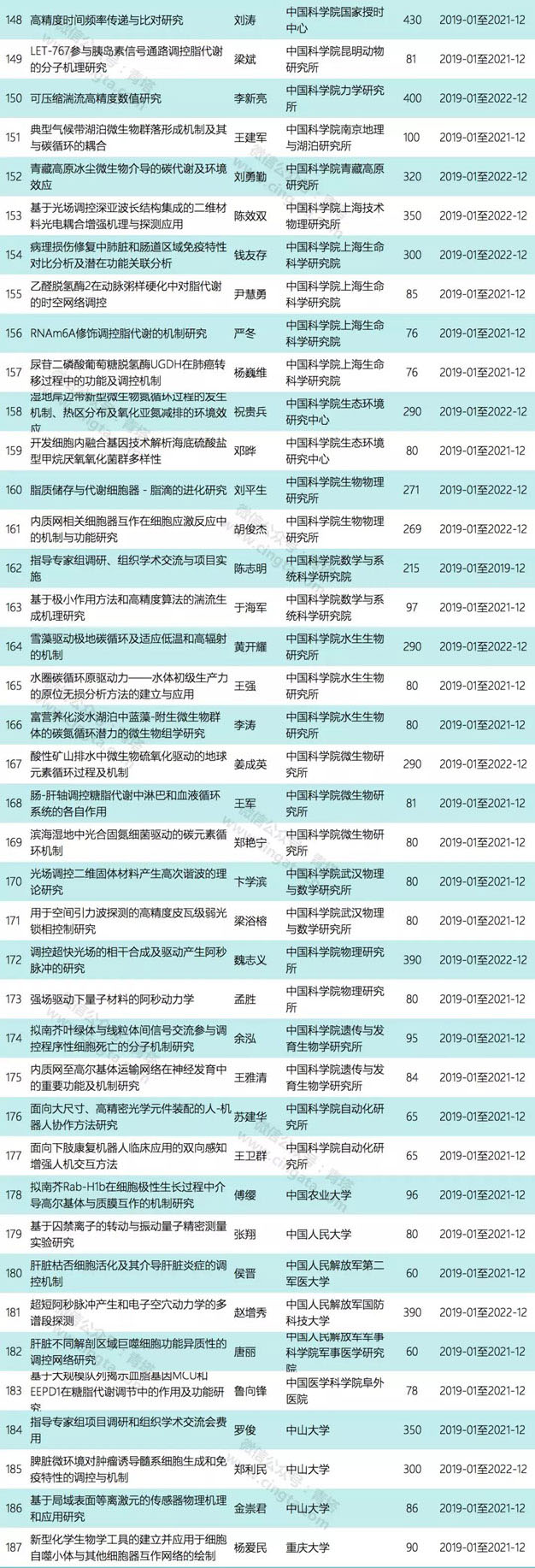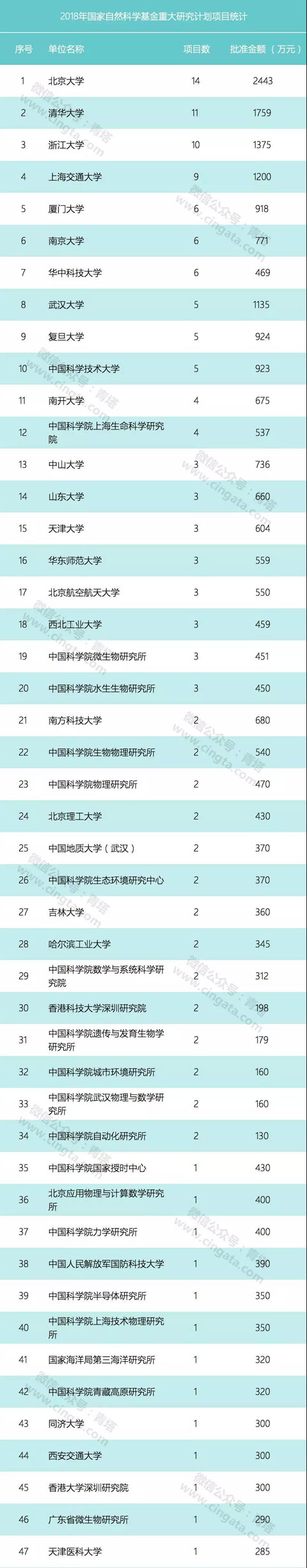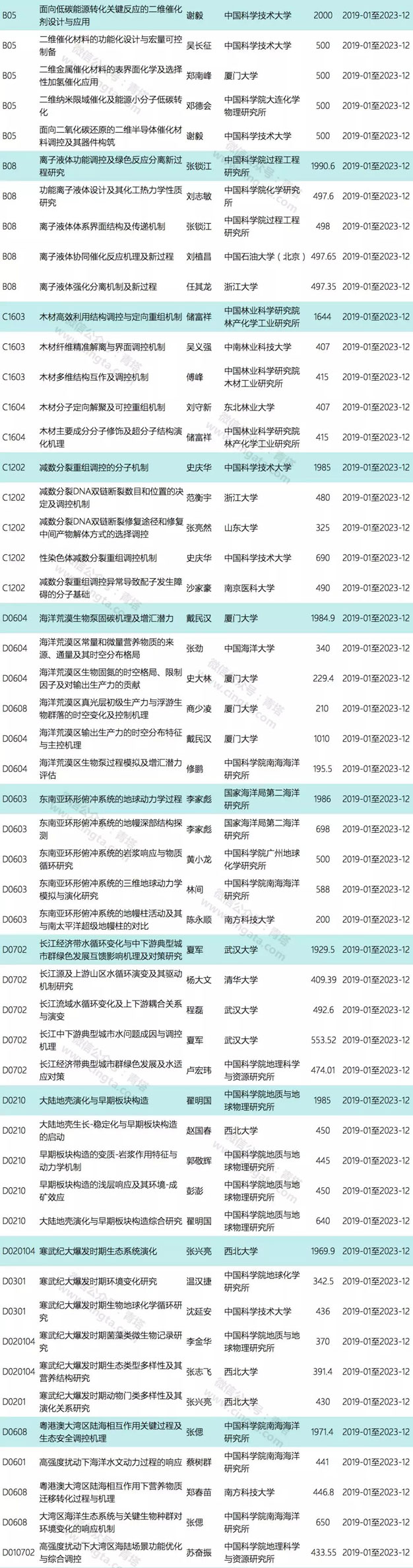 本次公布的项目为创新研究群体延续资助项目,共有10个项目获资助(单个项目的资助强度约为367万或525万)。10个项目来自8家单位,其中北京大学和浙江大学各有2项获资助。