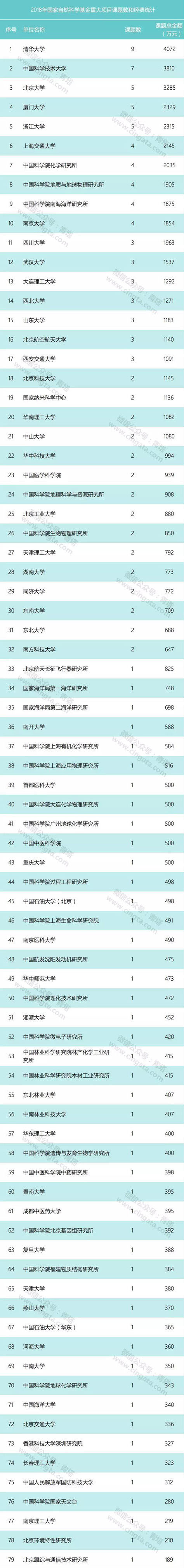 从2018年国家自然科学基金重大项目课题数统计来看,清华大学最多,共有9个子课题获资助,课题总经费4072万元。中国科学技术大学共有7个重大项目子课题获资助,位居第二位,总经费3810万元。北京大学、厦门大学、浙江大学各有5个子课题获资助,表现不俗。各单位获资助的子课题数和经费统计如下: