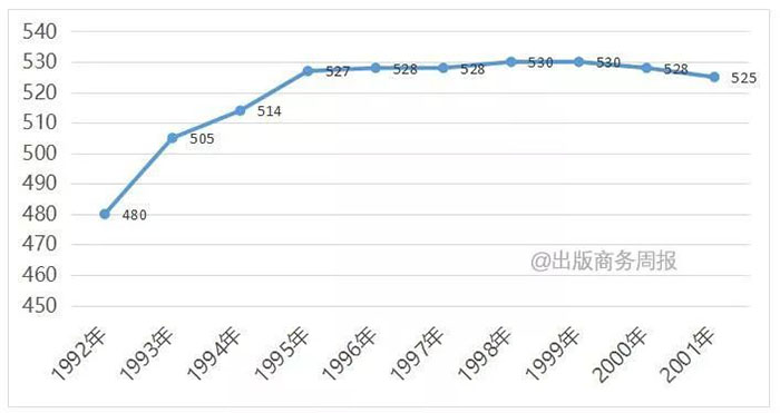 图4 优化调整时期(1992-2001)图书出版总量规模变化趋势图
