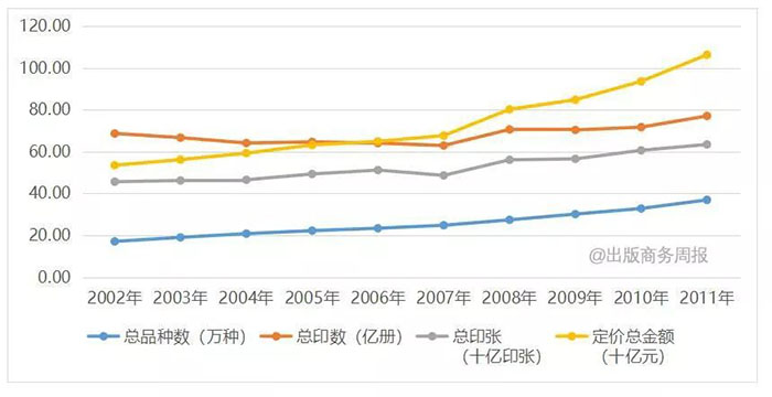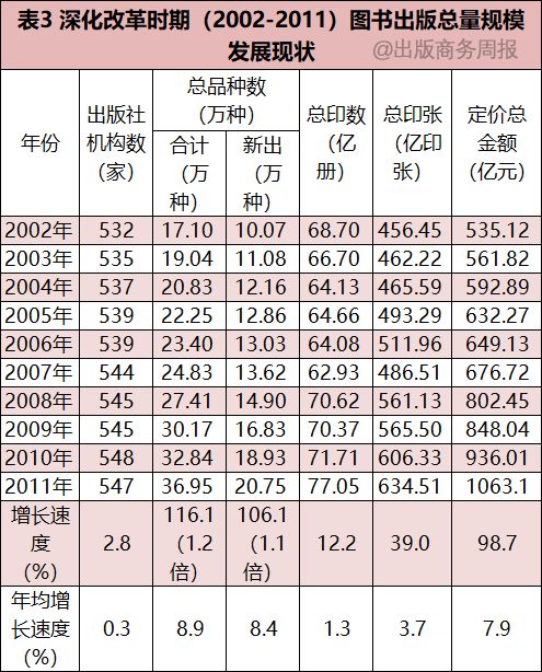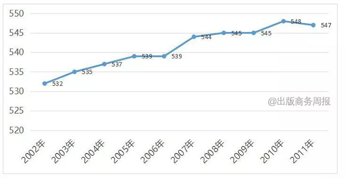 这一时期,出版社数量稳中有升,2002-2011年由532家增至547家,增加了15家;出版规模增长略快于上一时期,总品种数增长1.2倍,年均增长8.9%(其中新书出版品种增长1.1倍,年均增长8.4%);总印数增长12.2%,年均增长1.3%;总印张数增长39.0%,年均增长3.7%;图书价格增长趋于稳定,扣除物价上涨因素的影响,图书定价总金额增长98.7%,年均增长7.9%。(详见表3、图5和图6。)