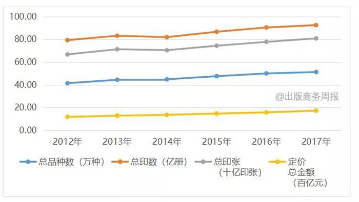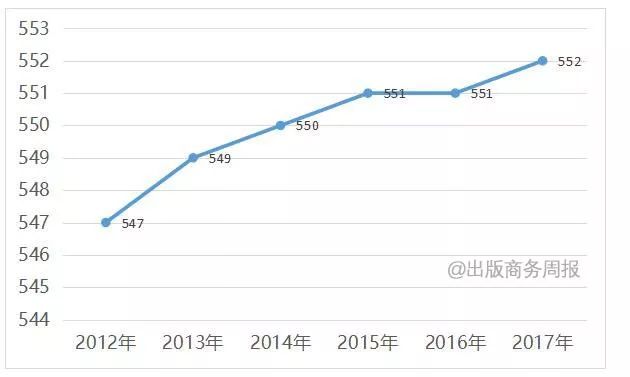 2012-2017年,全国出版社由547家增加到552家,数量基本保持稳定;总品种数增长23.8%,年均增长4.4%,其中新出品种增长速度(5.4%)明显低于重印品种增长速度(49.7%),说明图书出版单位由追求数量转向提高质量,结构调整进一步优化、市场整顿初见成效;总印数和总印张数除在2014年出现小幅回落外,整体呈现稳步增长态势;这一时期图书定价总金额较2012年增长46.3%,年均增长7.9%,低于上一时期的整体增长速度(扣除物价上涨因素的影响)。(详见表4、图7和图8。)