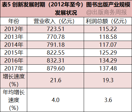 党的十八大以来,我国图书出版产业规模进入了快速发展的阶段,图书出版营业收入和利润总额持续上升,2017年实现营业收入879.60亿元,较2012年相比增长21.6%,年均增长速度4.0%;实现利润总额137.48亿元,与2012年相比增长19.3%,年均增长速度3.6%。(详见表5和图9。)