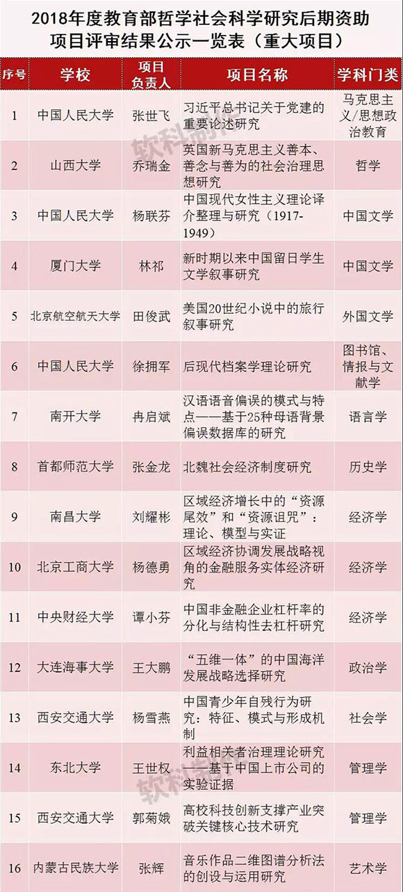 2018年度教育部哲学社会科学研究后期资助项目按照《教育部哲学社会科学研究后期资助项目实施办法(试行)》相关规定,经组织专家评审,共有99个项目通过评审。