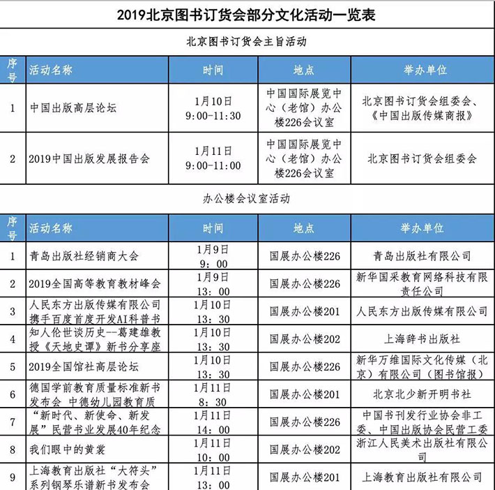 由中国出版协会、中国书刊发行业协会主办的2019北京图书订货会将于2019年1月10日~12日在中国国际展览中心(老馆)举行。本届订货会将继续坚持“为出版服务,为读者服务”的宗旨,为出版、发行、读者之间搭建沟通、交流、贸易的一站式服务平台,重点围绕中国改革开放40周年、中华人民共和国成立70周年等重大事项,集中展示中国出版界所取得的重要成果。
