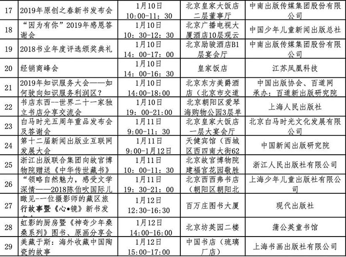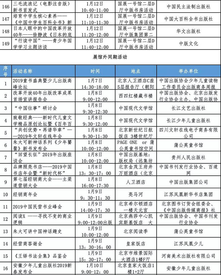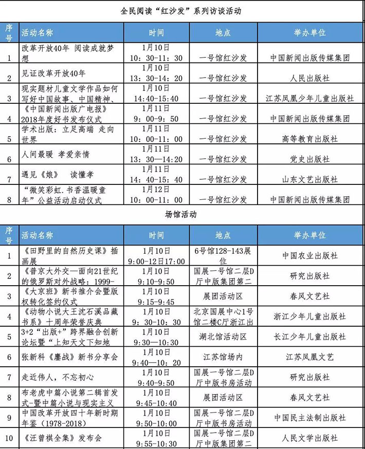 展会期间,将举办北京图书订货会出版高层论坛、中国出版发展报告会等系列信息交流活动,开展行业展览、主题出版展览、专题展览、全民阅读推广、新书推荐、作家见面会等一系列活动,整体展现在信息时代、智能化背景下的出版融合发展新局面。