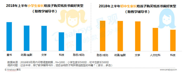 依托用户调查问卷及当当累积的大数据,2018中国学生阅读报告显示:在教辅书外,小学生和初中生购书行为大多为家长操作,因此家长们的购买行为也影响着孩子的阅读偏好,对于小学生,童书是销售最多的一大类型,初中生家长更在意对孩子的价值观引导,励志/成功类书籍位居第一。