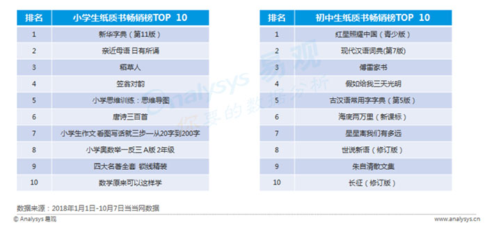 根据当当网2018年1月1日-10月7日的数据,小学生和初中生的纸质书畅销榜中,小学家长注重孩子的基础学习,小学生纸质书畅销榜TOP10中,人手一册的新华字典是中小学生必不可少的教辅工具,中国儿童文学,传统文化,四大名著都有涵盖;初中生畅销榜排名中能够看到,家长对孩子的教育侧重价值观引导,榜单图书多为《红星照耀中国》、《星星离我们有多远》等语文教材指定书目,以及新课标及部编本的推荐必读书,希望培养学生的自主学习能力,让学生接受并感知。